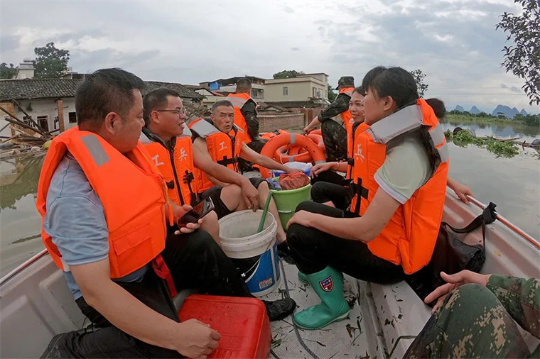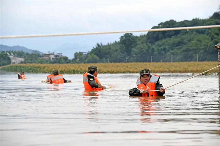 救援现场,救援队伍得知某村小学附近10名村民被洪水围困后,立即派出救援小分队,摸清现场水位、群众受困情况,随后采取防洪绳与背包绳互相牵引的方式,成功将10名村民转移到安全场所。