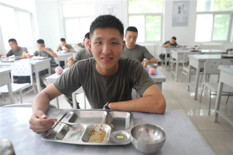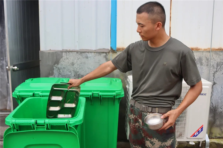 上午操课结束,该部某分队餐厅前,“团结起来准备打仗”的歌声嘹亮,官兵们迈着轻快的步伐走进餐厅自助选餐。用餐完毕后,只见餐盘干净、饭盆空空,泔水桶里也只有骨头、果皮等残余垃圾。