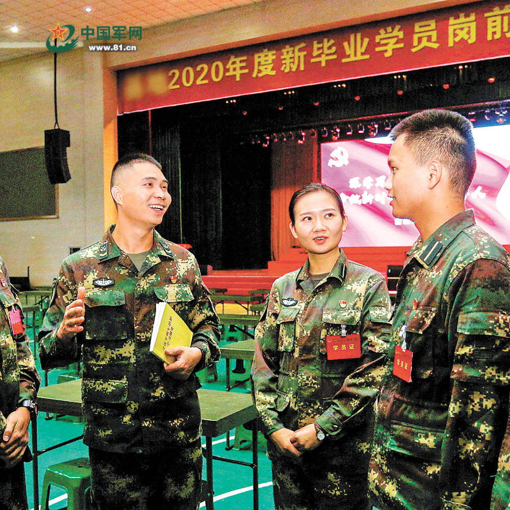 俞细文(左一)与单位分配来的新毕业学员交流。