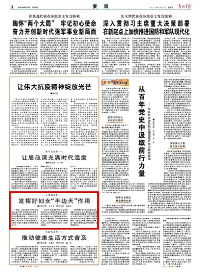 王雪梅委员说,妇女在家是母亲、是妻子、是女儿,在外是和谐社会的参与者、建设者和奉献者,必须发挥好妇女“半边天”作用。“时代赋予了我们更多的使命,我们要有巾帼不让须眉的豪情。只要认认真真、踏踏实实做事,每一名妇女都能实现多彩的梦想。”王雪梅委员说。