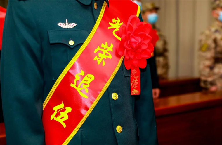 身披“光荣退役”绶带的退役士兵