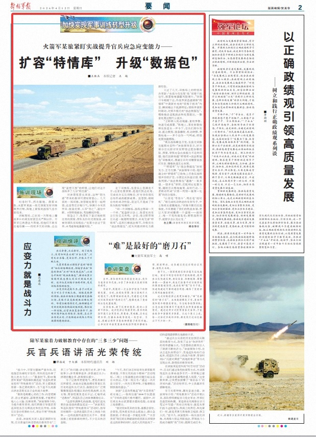 火箭军某旅以持续扩容的“特情库”细化训练颗粒度,倒逼官兵在“熟悉的阵地”应对“陌生的危机”;以动态升级的“战法数据包”,驱动处置方案随作战态势之变而不断迭代更新。这不仅是训练方法的升级,更是训练思维的转型。