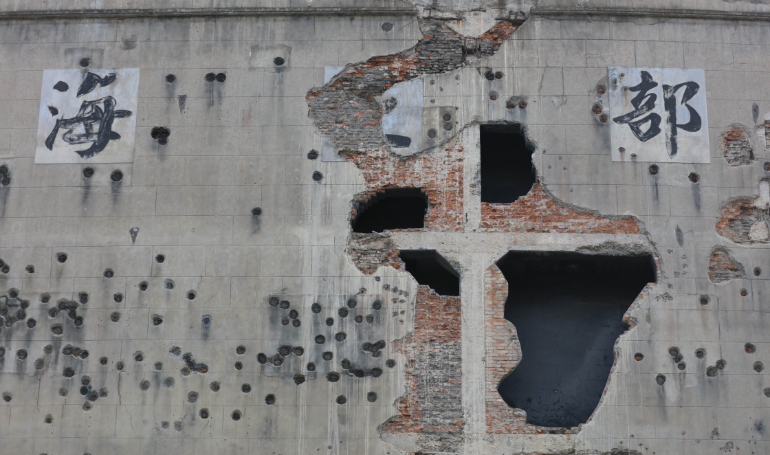 9月17日拍摄的四行仓库西墙上的炮弹孔和枪弹孔。