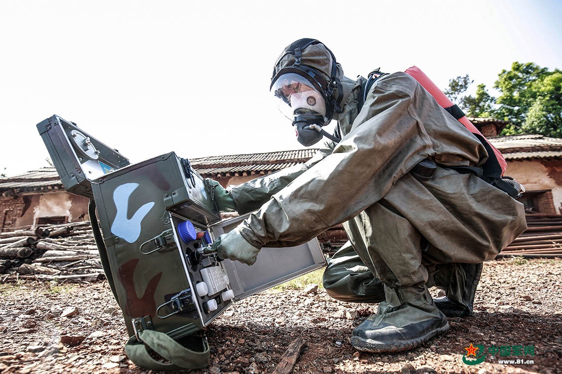 侦毒员利用毒物检测箱对现场有毒有害物质进行侦测判别