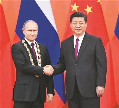 习近平指出,中华人民共和国“友谊勋章”是中国国家对外最高荣誉勋章,授予在支持中国现代化建设、促进中外交流合作、维护世界和平中作出杰出贡献的外国友人。普京总统是具有世界影响的大国领袖,也是中国人民的老朋友、好朋友。正是得益于普京总统多年来的高度重视和亲自推动,中俄关系经受住国际风云变幻的考验,政治和战略互信不断深化,各领域务实合作得到长足发展,两国人民友谊不断深化。高水平的中俄关系造福了两国人民,堪称当今世界大国、邻国和谐共处的典范,为推动构建新型国际关系、构建人类命运共同体作出了重要贡献。