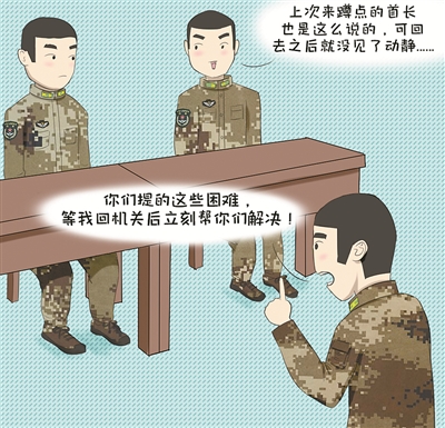 当兵蹲连是我军的优良传统,也是机关干部走进基层、融入官兵,找到基层建设真问题、取得真“疗效”的一种有效途径。但个别机关干部当兵蹲连存在官僚主义、形式主义现象——有的人在连队“心”在机关;有的融不进去深不下去;甚至有的变当兵为当“宾”。