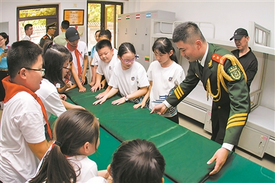 上图:在“六一”国际儿童节到来之际,武警北京总队执勤第五支队邀请北京市史家小学学生走进军营,通过观摩官兵训练、参观荣誉室和学习叠被子等活动,接受国防教育。胡尔根摄