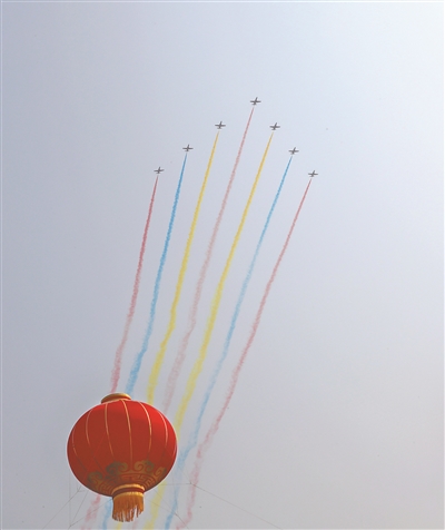教练机梯队划出7条美丽彩带,向共和国献上生日祝福。