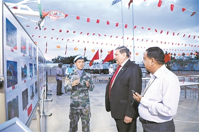 连日来,在完成好各项维和任务的同时,我第3批赴苏丹达尔富尔维和直升机分队举办了形式多样的活动,庆祝新中国成立70周年。图为官兵引导联合国官员参观在营区举办的“中国地域文化图片展”。 郝兆建摄