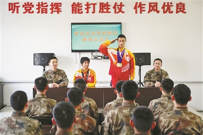 图②:女子跆拳道冠军伍嘉怡向基层官兵讲述金牌背后的故事。