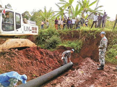 当地时间1月6日,我第23批赴刚果(金)维和工兵分队瓦伦古分遣队仅用1小时,就完成了托尼奥拉公路一段约20米长过水路面的积水清除、涵管埋设和路面平整夯实等任务,解决了当地村民长期以来的出行难题。图为我维和官兵埋设排水涵管。何 舜、陈仕现摄影报道