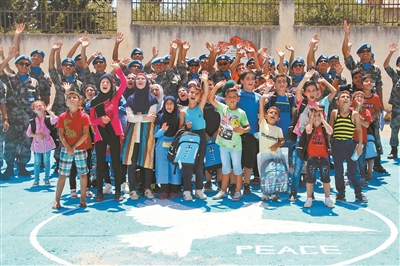 图①:维和官兵与玛加迪学校学生庆祝“中黎和平广场”竣工。