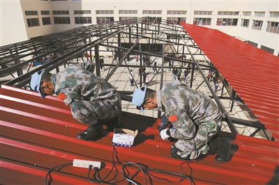 图②:官兵顶着烈日在“中黎和平广场”修建遮阳棚。