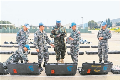 近日,中国第十八批赴黎巴嫩维和部队建筑工兵分队、医疗分队和多功能工兵分队顺利通过联黎部队装备与战备核查。图为联黎部队官员核查扫雷装备技术性能。本报特约记者 孙 帅摄