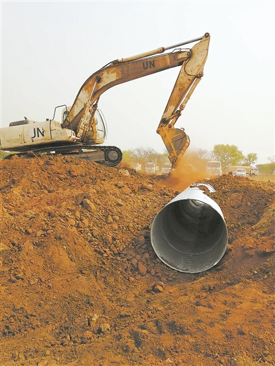 当地时间4月2日,中国第10批赴南苏丹维和工兵分队官兵克服高温天气带来的不利影响,仅用两天时间就高质量完成了马坡儿至瓦乌路段一处排水管线的铺设任务,确保当地道路畅通。图为施工现场。 许向民摄