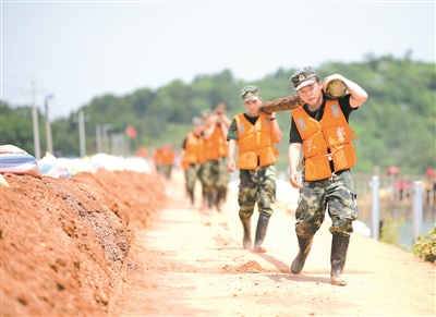 七月十三日,武警江西总队机动支队五十名官兵与鄱阳县双港镇双丰村、赵家湾村村民一起,加固赵家湾水库堤坝。图为官兵在水库堤坝上搬运木材。