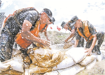连日来,第71集团军某旅在抗洪一线开展“抗洪英模学起来、党员先锋冲起来、战斗堡垒强起来”活动,激励官兵持续奋战。图为官兵在九江市棉船镇运送沙袋加固子堤。郝明明摄
