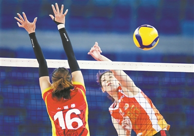 上图:天津女排球员李盈莹(右)在比赛中扣球。新华社发
