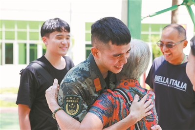武警广东总队执勤第三支队十ー中队战士余杰两年没回家了。在余杰生日这天,家人来部队探望他。当余杰见到家人时,他激动地上前紧紧抱住奶奶,流下了幸福的泪水。
