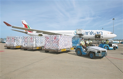 斯里兰卡总统戈塔巴雅7月27日在总统府会见中国驻斯里兰卡大使戚振宏时说,他曾领导斯里兰卡军队与恐怖组织作战,现在又领导全国人民与新冠疫情作战,这两场艰苦战争“关键时刻全靠中国”。图为当日工作人员在斯里兰卡科伦坡郊外的班达拉奈克国际机场运输最新一批抵达斯里兰卡的中国援斯新冠疫苗。 新华社发