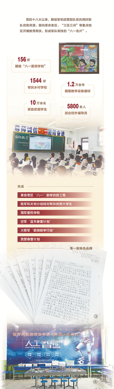 2020年,在军地共同推动下,全军部队援建的“八一爱民学校”增加到156所。持续10余年的教育帮扶,为革命老区打赢脱贫攻坚战、全面推进乡村振兴,注入源源不断的生机与力量。