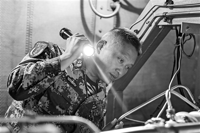 这样的面孔,几乎长在每一名老机电兵脸上。进入机舱,马正江用力擤了擤鼻子。充斥着机油味的空气有点刺鼻,马正江却说:“这个味才对,才让人安心。”