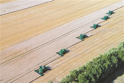 近日,北大荒农垦集团有限公司在黑龙江省各地的小麦收获工作全面展开,今年小麦种植面积为7.7万余亩,目前已收获1万余亩。图为8月10日,联合收割机在田间收获小麦(无人机照片)。 新华社记者 谢剑飞摄