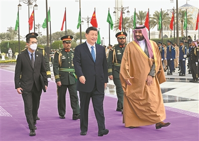 沙特王储兼首相穆罕默德在下车处热情迎接。两国领导人步入检阅亭,王宫军乐团奏中沙两国国歌。习近平在穆罕默德王储陪同下检阅王宫仪仗队。沙特王宫卫队以传统执剑礼仪向习近平表示最隆重欢迎。