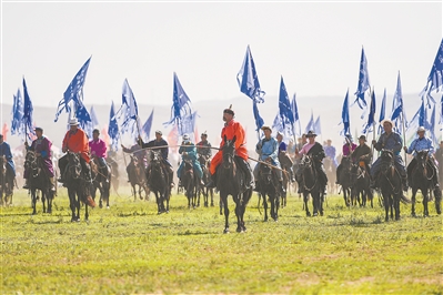 图③:群众马队方阵在第32届那达慕开幕式上表演。