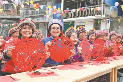 农历兔年春节将至,随处可见各种兔元素的饰品、工艺品,处处洋溢着浓浓年味。图为1月16日在广西河池市罗城仫佬族自治县四把镇思平村小稔屯,民间剪纸艺人展示自己的生肖兔剪纸作品。新华社发