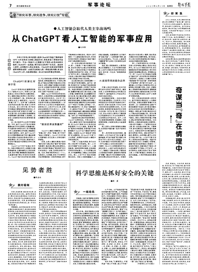 今年3月中旬,聊天机器人程序ChatGPT推出了最新版本GPT-4,可支持多元的输入输出形式,使其具备了更强的专业学习能力。作为一种基于人工智能(以下简称AI)技术的聊天程序,ChatGPT一经推出,便引起社会各界广泛关注。甚至有人惊呼,AI将取代人类主宰战场。ChatGPT究竟会给军事领域带来哪些变革?AI是否会超越人类?带着这些问题,本文从ChatGPT入手,为读者梳理出一条AI大致的军事应用脉络。