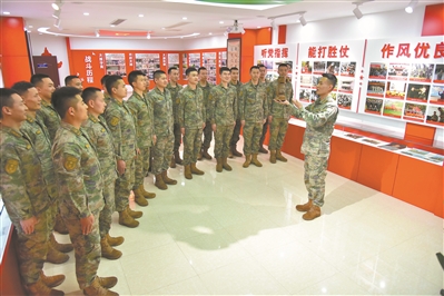 “荣誉簿上添新篇,先辈精神代代传……”荣誉室内,官兵捧着牌匾、奖杯,与第13任指导员朱明仓视频连线时,不约而同地唱起了自编的队歌。激昂的旋律中,蕴含着官兵干出好样子的决心,蓄积着官兵向着新目标不断冲锋的底气……