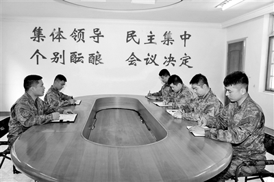 上图:陆军某旅机关业务部门依据相关法规研究制订精简会议、纠治“五多”问题措施办法。桂方青摄