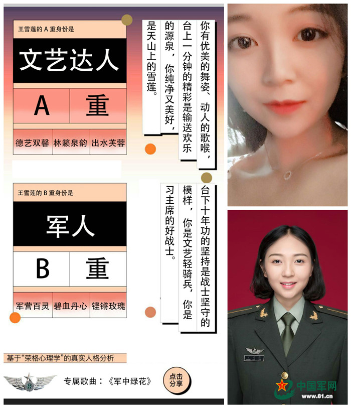 人物小传:王雪莲,女,彝族,2015年9月入伍,先后担任班长、宣传委员、指导员等职务,擅长民族舞和管弦乐表演,任学员队宣传委员期间,组织排演的歌伴舞在元旦晚会上荣获三等奖、大队歌唱比赛任指挥获得二等奖。获嘉奖、“先进妇女奖”各一次,在“奋进的陆军”业余文艺汇演中获表演三等奖一次。学习成绩优异,获全国大学生英语竞赛三等奖。军事过硬,连续两年获得校级跳高比赛第二名。