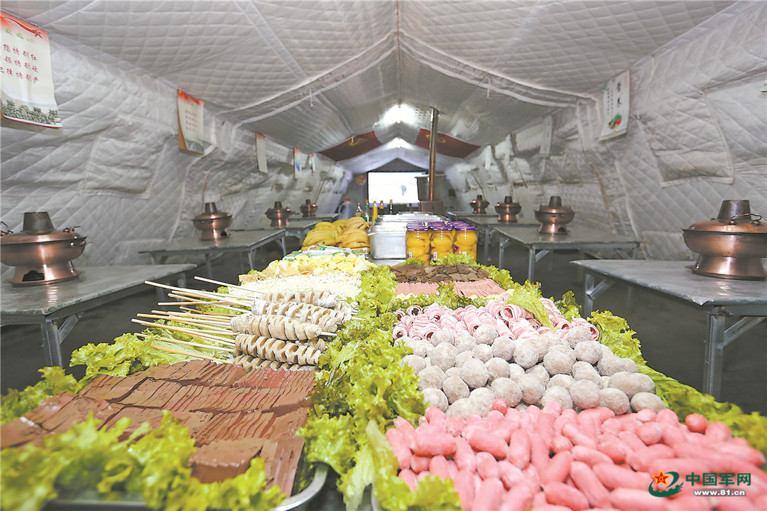 晚饭时间到了。记者在高炮连看到,官兵吃的主食是千层饼、臊子面、酥脆麻花,菜品有红烧肉炖粉条、清炖羊肉、麻辣豆腐、素炒青菜等。而在火箭炮连,官兵吃的则是火锅,餐桌上摆着上海青、毛肚等数十种菜品。