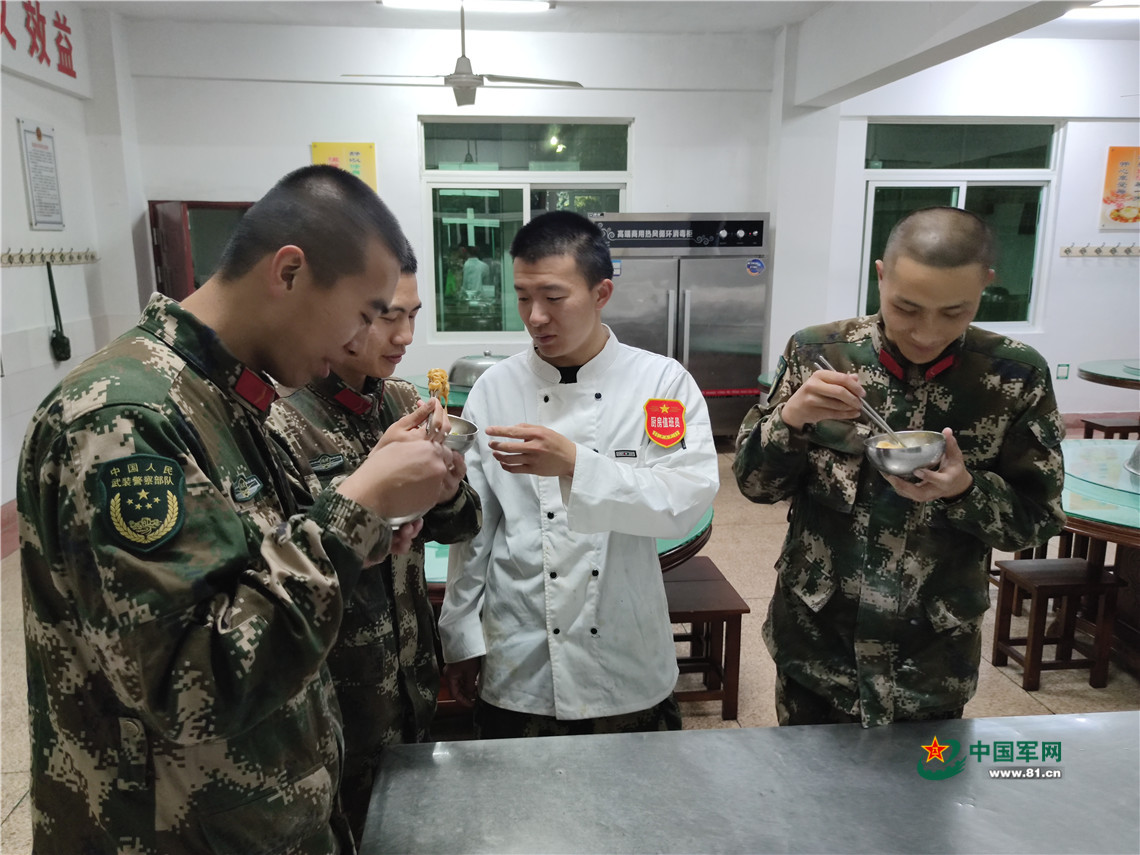 又一天中午,中队长沈海斌问道:“同志们,今天的家乡菜北京炸酱面香不香?”“香!”战士们异口同声地回答道。此时正在后厨收拾厨具的莫昕阳露出了欣慰的笑容,而各班的餐桌上摆放着香喷喷的北京炸酱面,正是他和几个北京来的战士仔细琢磨出来的家乡味。