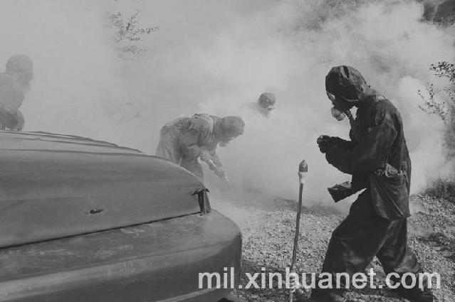 1981年9月,华北军事大演习中,防化兵在染毒地段进行侦毒作业。 王建民