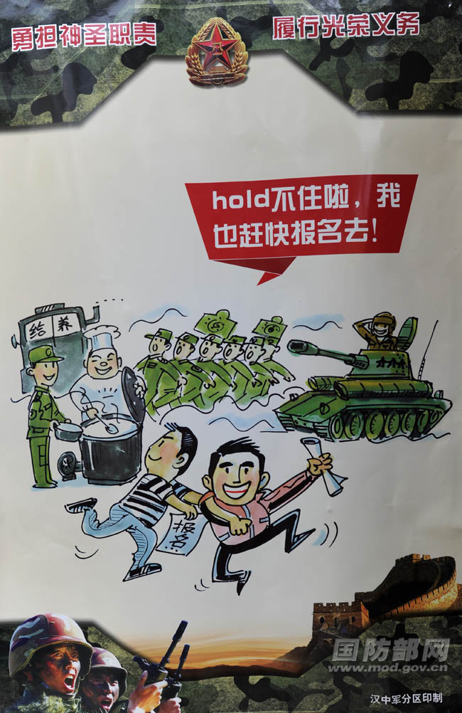 陕西省汉中军分区打破传统思维,创新方法手段,编印征兵宣传漫画挂图,引入“亲,当兵去”、“没当兵的青春伤不起”等网络潮语,增强了征兵宣传的吸引力和感染力。