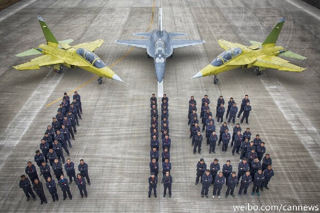 近日,中航工业官方微博发布了国产L15“猎鹰”高级教练机的拜年贴画。3架新造的L15教练机同时停在地面上,由厂方人员摆出“L15”的字样向大家拜年。(图片来源:中国航空报 官方微博)