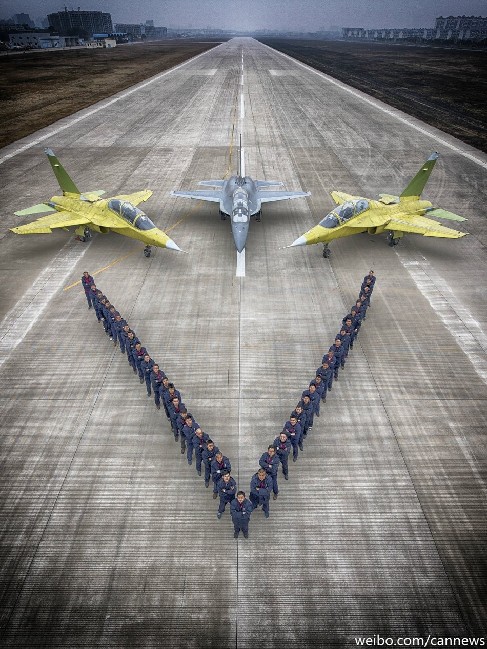 近日,中航工业官方微博发布了国产L15“猎鹰”高级教练机的拜年贴画。3架新造的L15教练机同时停在地面上,由厂方人员摆出“L15”的字样向大家拜年。(图片来源:中国航空报 官方微博)