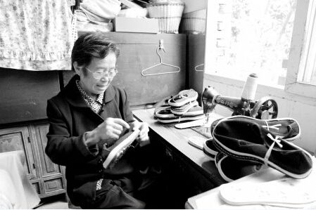 在80年代初,唐明宪老人和丈夫每个月的工资加起来也就几十块钱,还要供5个孩子上学读书,除去基本的生活开销,生活已十分拮据。为了节省开支,能多买些布料,一家人经常吃咸菜或者菜市场里最便宜的素菜,日子过得十分清苦,可即便如此,钱还是筹不够。于是,她就去捡破烂,一个牙膏皮5分,一包旧鞋5毛……还让她上班的女儿捡回车间里废弃的油碎布,和着碱放锅里煮了拿去卖,才三毛五一斤。凑足了钱,就去买布、买针线。为了多做一些布鞋和鞋垫,唐明宪老人把一分一毫辛苦攒起来的钱,又拿去买了一台牡丹牌缝纫机……自打有了布、针线和缝纫机,唐明宪老人家中的灯,在整个小区就成了开得最早而熄得最晚的那一盏。在一天的大部分时间里,唐明宪就是坐在缝纫机前,弯着腰、低着头、眯着眼,一针一线地扎鞋垫、纳鞋底,这几乎成了她最大的乐趣。