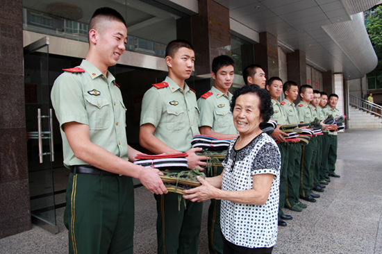 2011年7月30日下午,在攀枝花消防支队一楼大厅,唐明宪老人和消防战士们握手。看着慈爱的老人,揣着老人千针万线做出来的布鞋和鞋垫,战士们感动不已。攀枝花市消防支队主要领导代表全市消防官兵感谢唐明宪夫妇和马家湾社区长期以来对消防官兵的关心和攀枝花消防事业的发展。支队负责人说:“做好事不难,难的是一辈子做好事,唐大妈30年如一日,坚持为部队官兵做好事,精神难能可贵,全市消防官兵决不辜负驻地父老乡亲对消防官兵的关心和厚爱,穿上唐大妈的布鞋‘走好步’,一定会以实际行动在工作岗位上努力拼搏,练就过硬本领,积极为保卫一方平安,服务地方经济发展奉献自己的全部力量。”