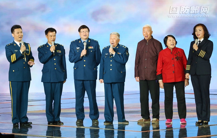 2015年3月9日,阎肃(中)和战友石顺义、车行、刘和刚等做客央视一号演播厅《会上嘹亮》栏目,在录制现场与粉丝一家人一起激情高歌《我爱祖国的蓝天》。郭幸福摄