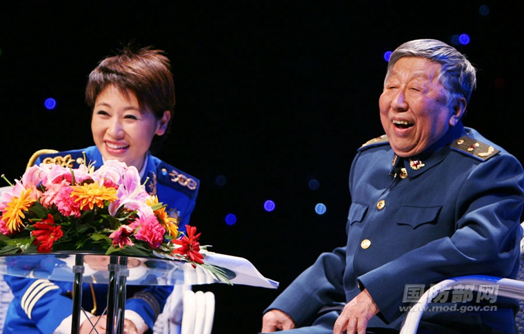 2007年3月,阎肃(右)在空军蓝天剧院主持“蓝天四季”音乐会。郭幸福摄
