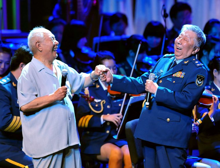 这是2010年7月25日,在北京举行的阎肃作品音乐会上,阎肃(右)与《军营男子汉》的作曲姜春阳一起演唱《军营男子汉》。新华社记者 罗晓光摄