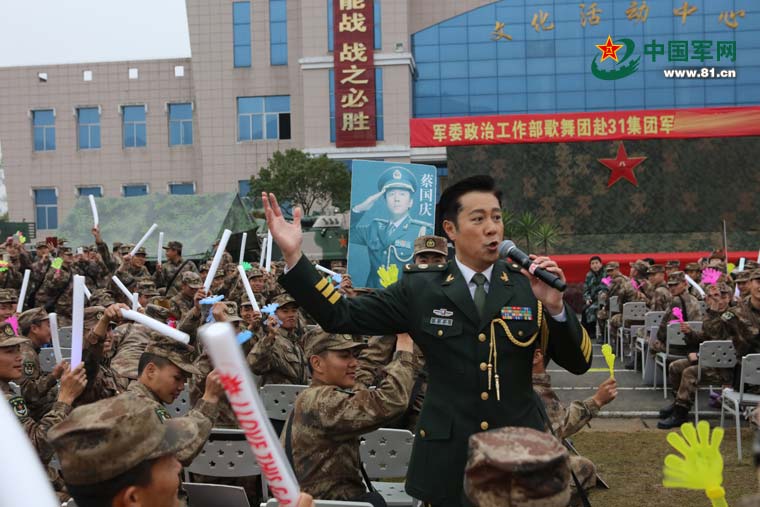 著名歌唱家蔡国庆为战士激情演唱歌曲《士兵的桂冠》《军中帅哥》等。