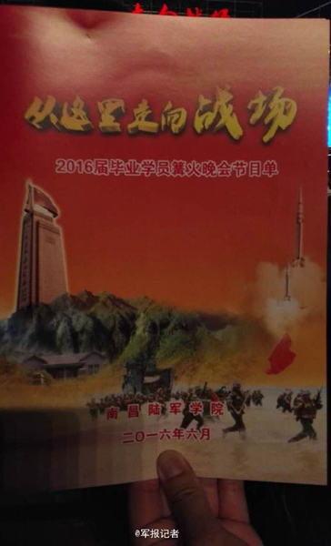 6月23日晚,南昌陆军学院2016届毕业学员晚会热闹开场,正在南昌参加“网络媒体国防行”活动的人员与在校师生一起观看。学员们表演的《在太行山上》《打靶归来》《映山红》《咱们陆院英模多》等一系列精彩节目次第登场!