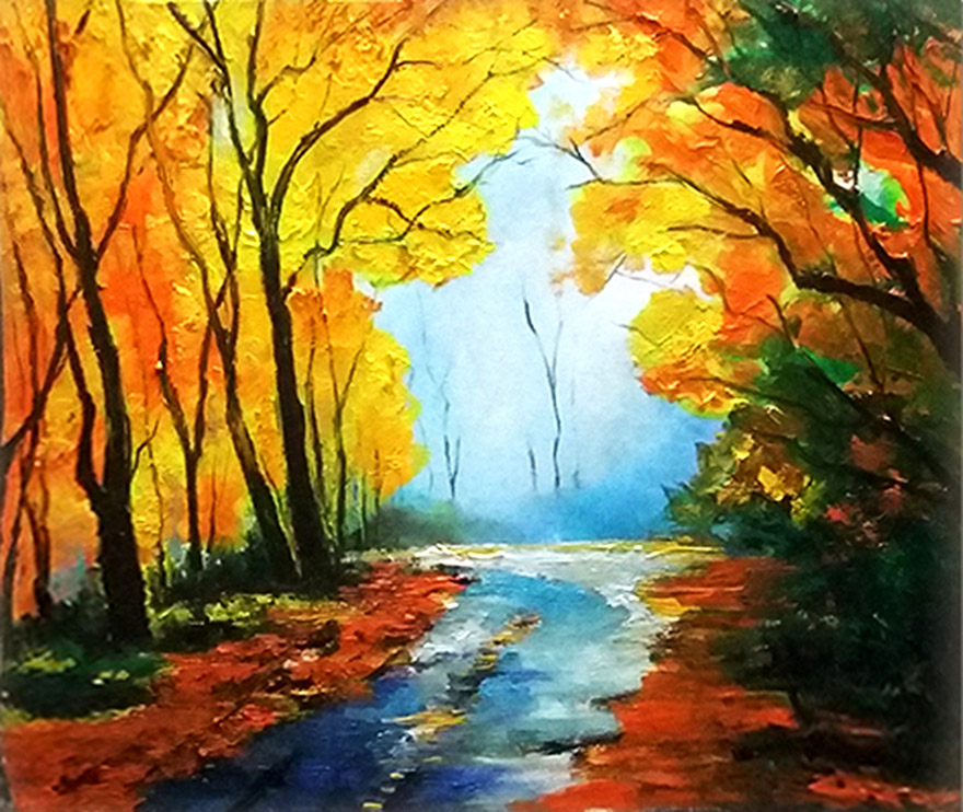 看吧,这是多么美丽灿烂的橘红与橘黄色!橘红——是太阳初升与落山时的风采;既欣欣向荣又温情款款;橘黄——是月亮熬到金秋收获的季节、挨到浪漫中秋团圆夜时的喜悦,既鲜明耀眼又含蓄蕴藉。那蓝盈盈的溪水与天相连,仿佛是蓝天白云的亲生女儿一般,心底透亮而又明澈,性格欢快而又活泼,她是属于远方的游子,正在向着远方奔去……而那奔流的溪水像是仰着脸蛋,对着金灿灿的秋树在说,而且不停地在说:“抱抱我!”“抱抱我!”“抱抱我!”——是的,这也是属于母亲和女儿的甜蜜,人到中年与豆蔻年华之间的甜蜜,是“属于你我的甜蜜”。