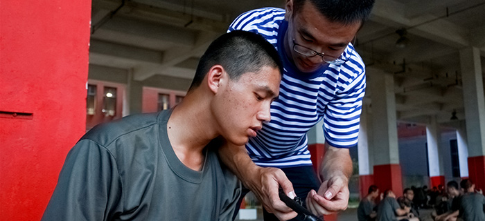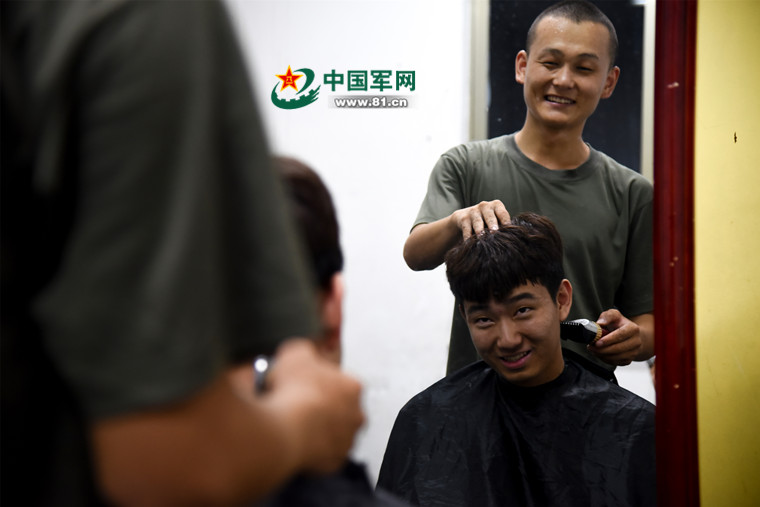 三毫寸头是军营标配。这时,班长化身理发师为我无偿服务。