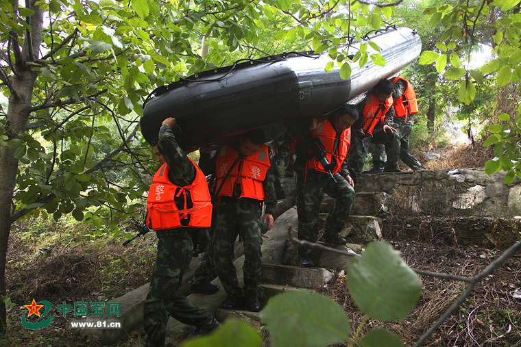 凌晨4时30分开始,每个小组协力肩扛1艘橡皮艇(重量240公斤),武装奔袭23公里,时限3小时。每小组完成抢滩突击5次。辅助完成操舟训练、划舟训练、扛舟训练3小时。全程贯穿按图行进、野战生存、野外宿营等课目。